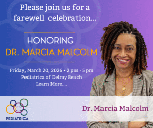 For more than 20 years, Dr. Marcia Malcolm has prioritized supporting all Delray community families to access quality care, setting them up for a lifetime of good health. Now, we invite you to join us in celebrating her commitment to the community and wish her well as she retires from the practice. You’ll also be able to meet and visit with the rest of the Pediatrica of Delray Beach team, including Dr. Tayina Gilles who remains steadfast in her commitment to caring for your family.